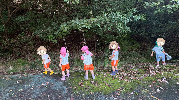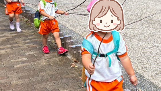 歩いている途中、木の枝を見つけるとさっと拾い上げる子どもたち。