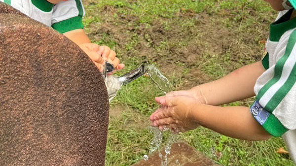水を出すのにはちょと力がいるから…友だちと協力してる!